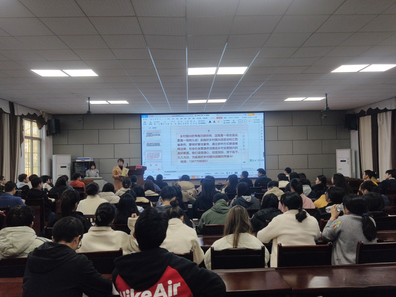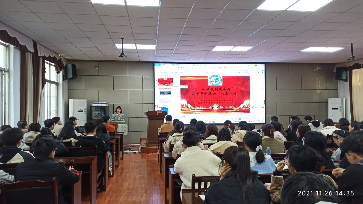 董蕾副处长以《从法规制度层面筑牢乡村振兴“四梁八柱”》为主题,首先从提出乡村振兴战略的重大意义与内涵引入制定《江西省乡村振兴促进条例》的主题;然后,从制定《条例》的目的与意义、制定《条例》的指导思想及原则、《条例》的主要内容、《条例》亮点解读及以案释法四个方面开展讲座;最后,和同学们进行了深入的互动。
