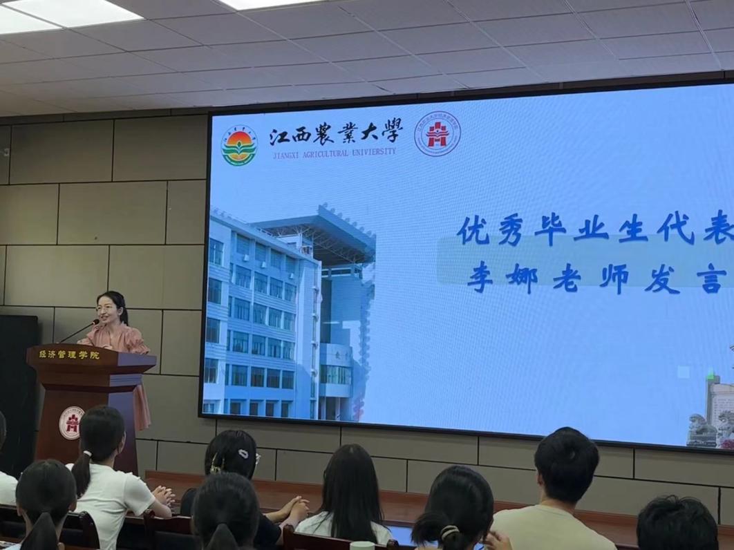 从农大出发又回归农大的2011届毕业生李娜,从学生角度出发以自身金融1103班为例子,从考研升学率,本班同学在各行业机关的就业情况两个方面为新生进专题分享。并指出希望24级新生们重视学习,以学业为本,学会独立自主思辨问题并跨界学习,始终保持对学习的热爱,不负自己,不负将来。李娜将自身的经验和感悟告诉新生并点明“现在的处境取决于过去的决定,未来所有的期待都在路上”。愿24级的新生们也能在自己的道路上熠熠生辉。最后,来自金融2203班的在校生代表徐欣然、金融2401班的新生代表廖雯纯同学作交流发言。
