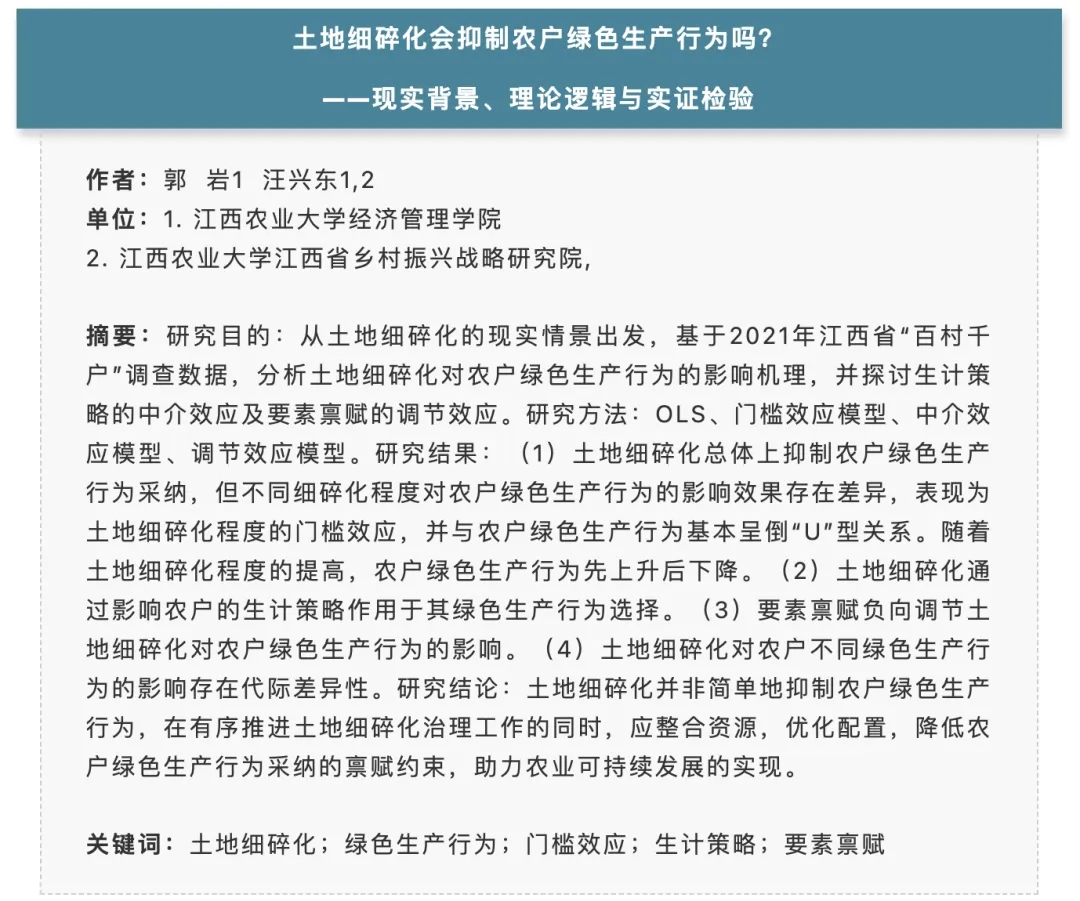 近日,汪兴东教授作为通讯作者的文章“土地细碎化会抑制农户绿色生产行为吗?——现实背景、理论逻辑与实证检验”发表在CSSCI来源期刊《中国土地科学》2024年第4期,第一作者为汪兴东教授所指导的博士生郭岩。