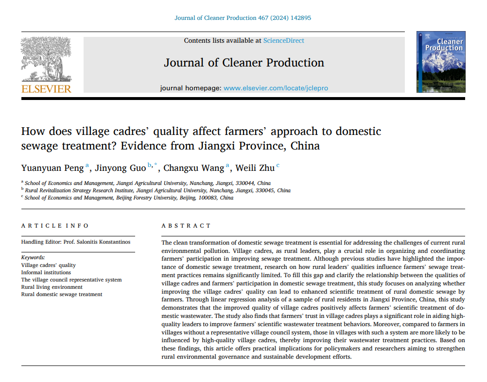 近日,乡村振兴战略研究院副院长、经管学院博士生导师郭锦墉教授团队的文章“How does village cadres’ quality affect farmers’ approach to domestic sewage treatment? Evidence from Jiangxi Province, China”(村干部素质如何影响农村居民处理生活污水? 来自中国江西省的证据)发表在国际知名期刊《Journal of Cleaner Production》(中科院SCI期刊一区,环境科学与生态学TOP,影响因子11.1)。第一作者为农林经济管理专业2022级博士生彭元元。