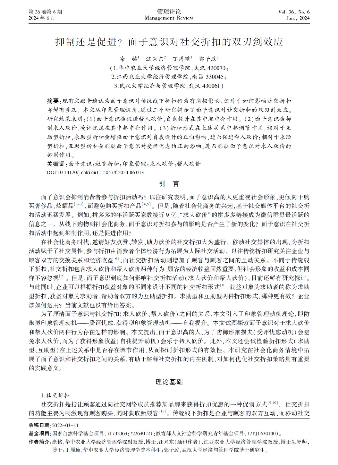 《管理评论》2024年第6期发表了“抑制还是促进?面子意识对社交折扣的双刃剑效应”,作者为:涂铭、汪兴东(通讯作者)、丁周瑾、郭子政。