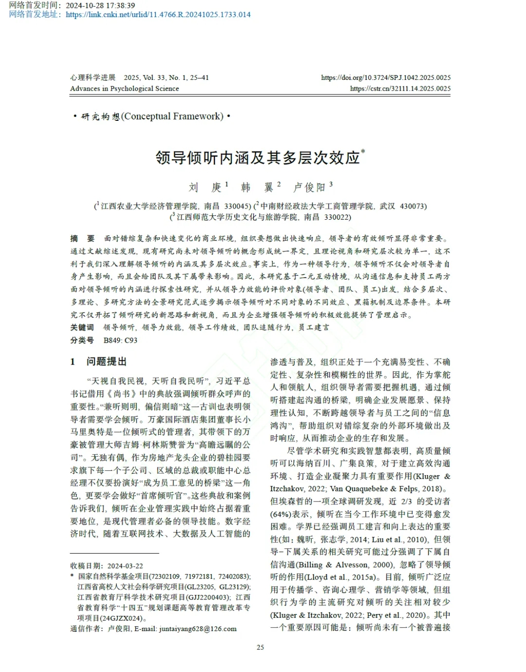 近日,CSSCI来源期刊《心理科学进展》首发了我院教师刘庚博士的研究论文“领导倾听内涵及其多层次效应”。