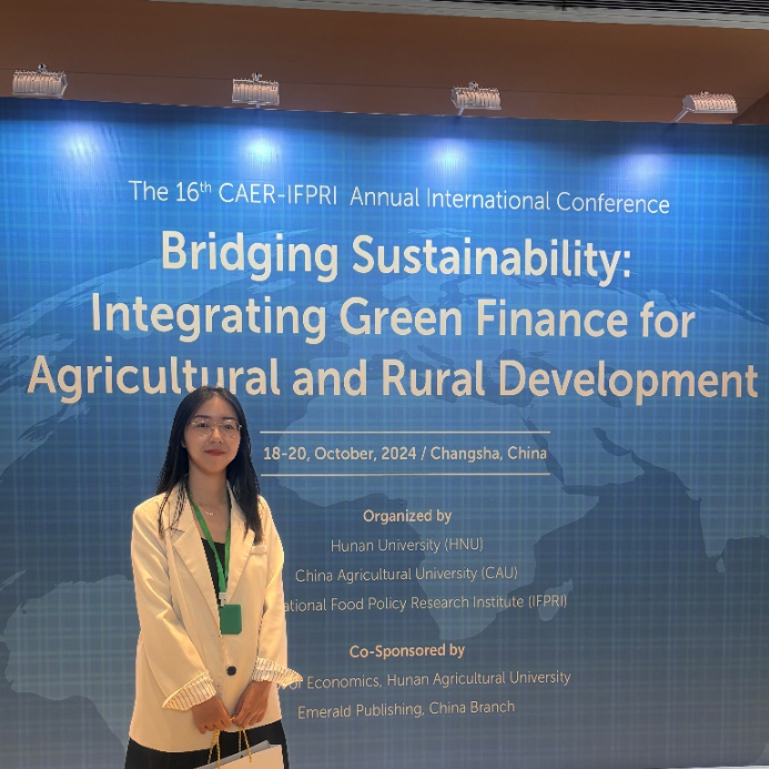10月18日-20日,第十六届CAER-IFPRI国际学术年会在湖南长沙召开。本届会议主题为“Bridging Sustainability:Integrating Green Finance forAgricultural and Rural Development”,由湖南大学、中国农业大学、国际食物政策研究所(IFPRI)主办,湖南农业大学和英国Emerald出版集团协办。我院2022级博士研究生彭元元参会并对近期研究论文《The impact of agricultural land endowment on the adoption behavior of green production technologies by farmers: based on evidence from Jiangxi Province, China》进行墙报展示交流。