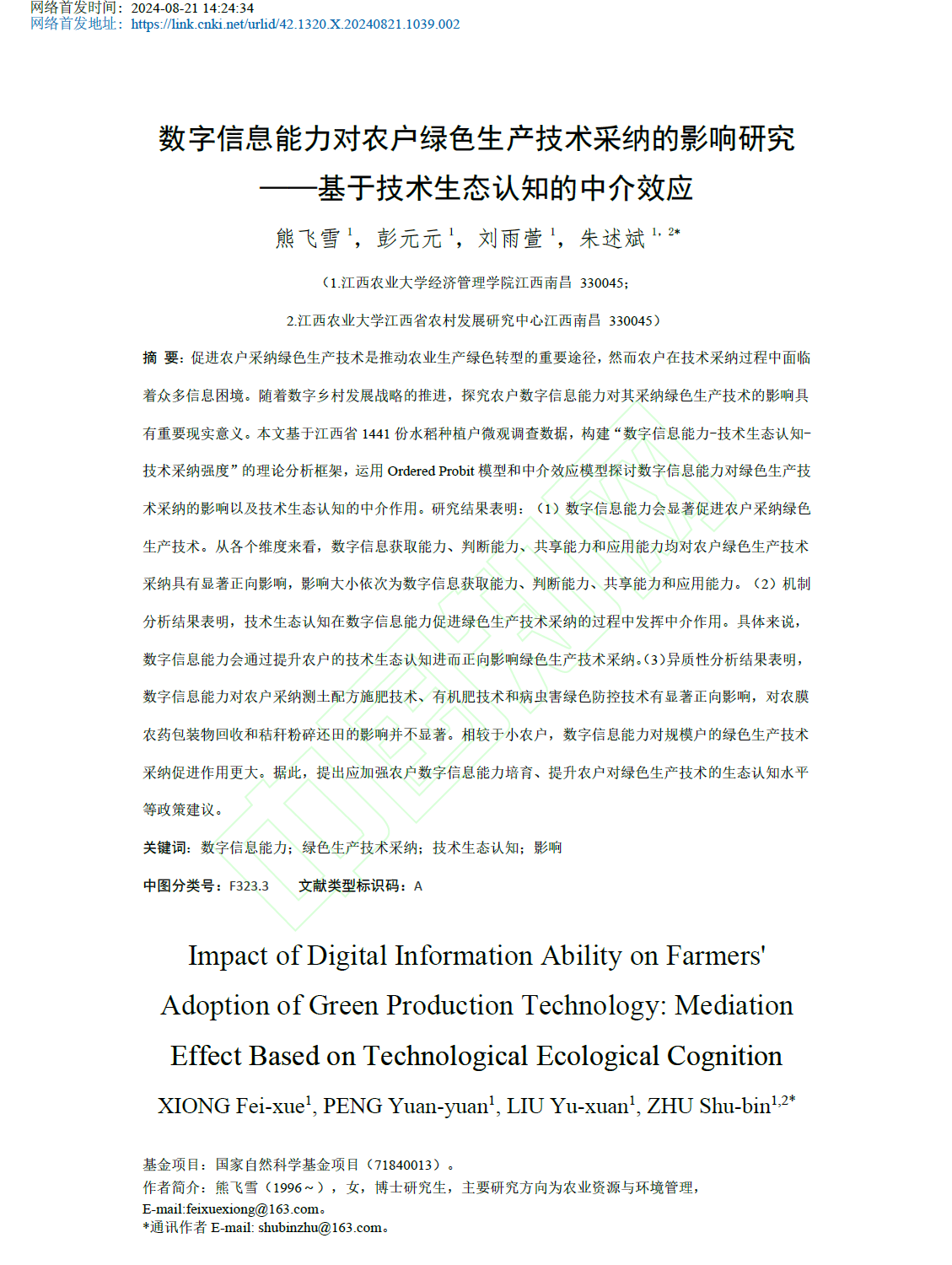 近期,朱述斌教授团队的研究论文“数字信息能力对农户绿色生产技术采纳的影响研究——基于技术生态认知的中介效应”在CSSCI来源期刊《长江流域资源与环境》发表,第一作者为博士生熊飞雪,朱述斌教授为通讯作者。