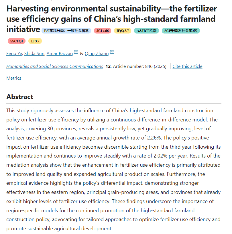 引用格式:Ye, F., Sun, S., Razzaq, A. et al. Harvesting environmental sustainability—the fertilizer use efficiency gains of China’s high-standard farmland initiative. Humanit Soc Sci Commun 12, 846 (2025). https://doi.org/10.1057/s41599-025-05140-z