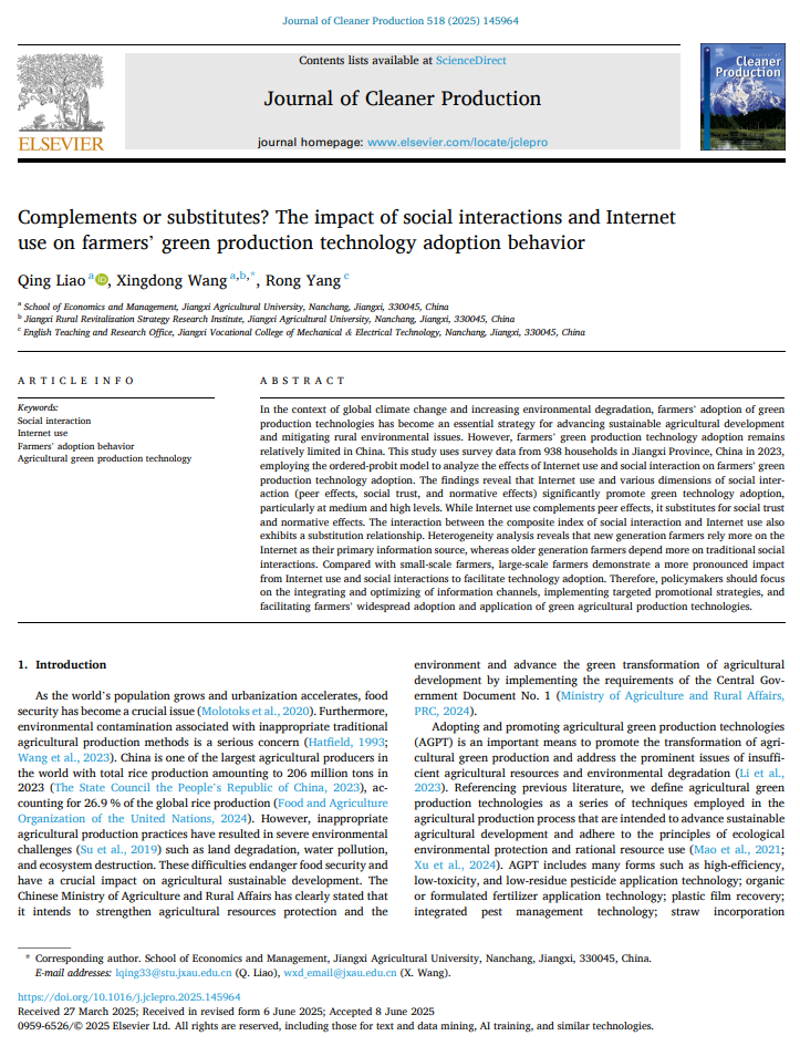 2025年6月,经管学院博士生导师汪兴东教授作为通讯作者的文章“Complements or substitutes? The impact of social interactions and Internet use on farmers’ green production technology adoption behavior”发表在《Journal of Cleaner Production》(中国科学院1区Top期刊,影响因子9.8)。第一作者为汪兴东教授指导的博士生,江西农业大学经济管理学院2024级博士生廖青。