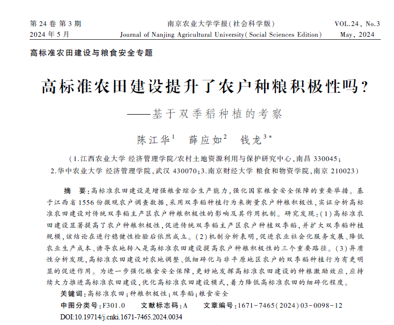 近日,我院陈江华副教授以第一作者身份撰写的论文“高标准农田建设提升了农户种粮积极性吗?——基于双季稻种植的考察”在《南京农业大学学报(社会科学版)》2024年第3期发表,第二作者为华中农业大学经济管理学院硕士生薛应如(江西农大农林经济管理本科毕业生),通信作者为南京财经大学钱龙副教授。《南京农业大学学报(社会科学版)》是学界公认的高水平期刊,影响因子较高,当前复合影响因子为10.769,综合影响因子6.61,为CSSCI来源期刊、AMI核心期刊、国家社科基金资助期刊。