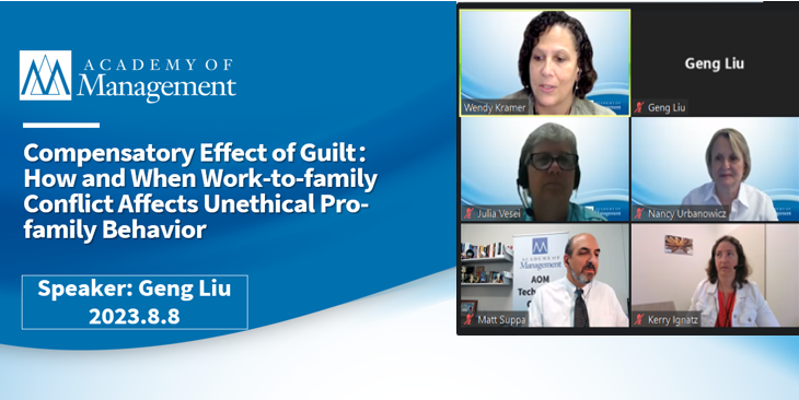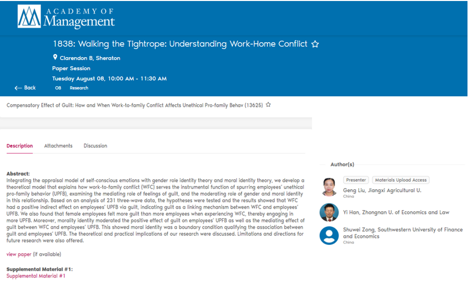 8月4日至8日,第83届美国管理学会(Academy of Management,AOM)年会在美国波士顿召开。我院工商管理系教师刘庚博士以第一作者投稿的论文“Compensatory Effect of Guilt: How and When Work-to-family Conflict Affects Unethical Pro-family Behavior”经双盲评审,被第83届AOM年会接收。