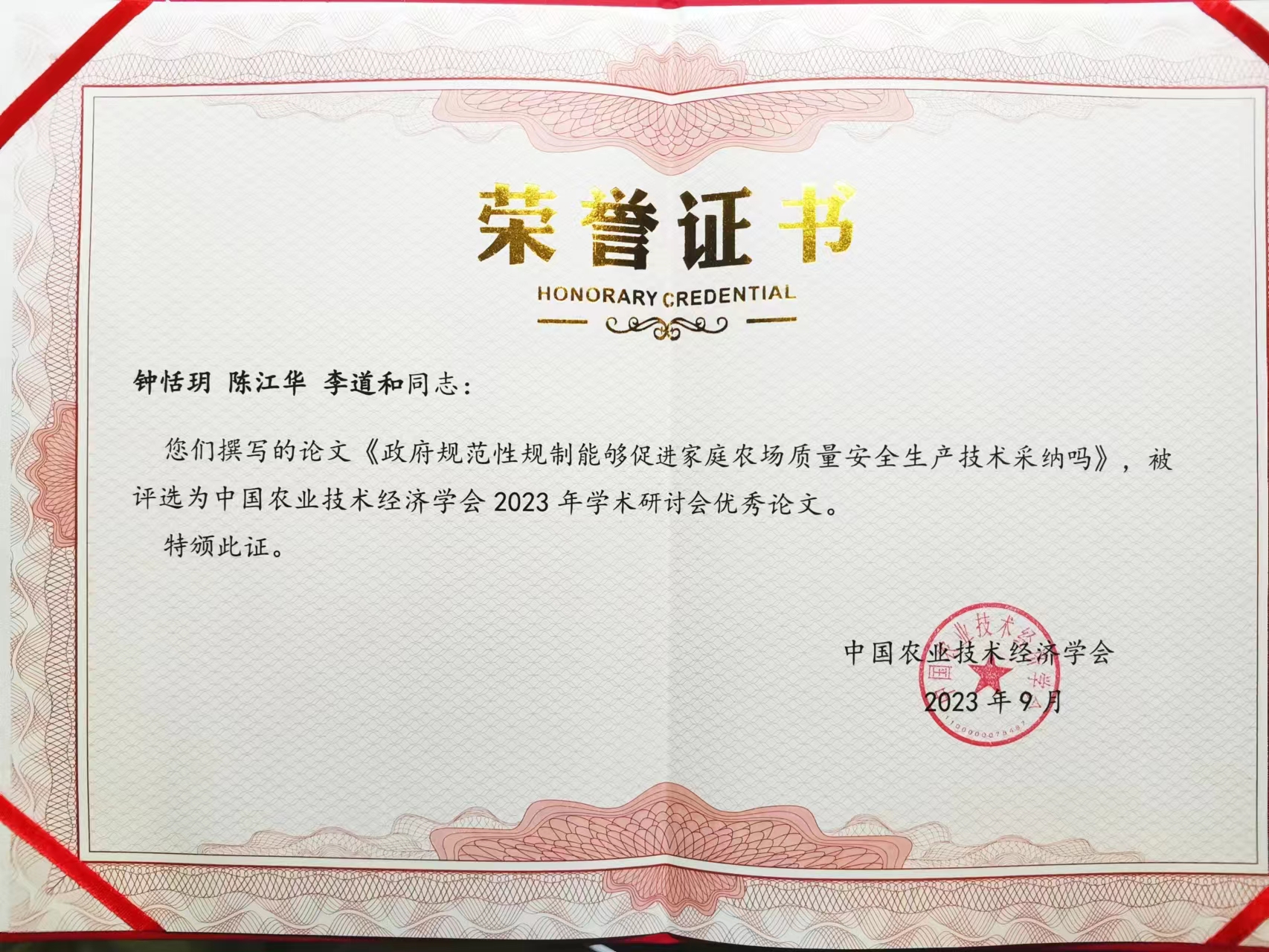 据悉,本次学术研讨会共收到投稿论文287篇,其中48篇论文通过评审入选作报告;会议期间进行了2场大会报告、6个征文分论坛,来自全国各地近百所高等院校和科研机构的300余名专家学者参会。大会最后根据匿名专家筛选和与会评审老师的意见共评选出优秀论文10篇,我院由钟恬玥、陈江华、李道和(通讯作者)撰写的篇论文被评选为优秀论文。
