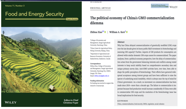 经管学院肖智华副教授作为第一及通讯作者发表在《Food and Energy Security》(中科院, 1区Top刊)上的文章“The Political Economy of China’s GMO Commercialization Dilemma”受到全球学者们的广泛关注,在发表后的三个月内文章的全文下载量在该期刊中国作者2022年第三季度中排名第一。肖智华因此获得“Wiley威力中国开放科学高贡献作者”奖,这是我院教师首次获得该奖项。