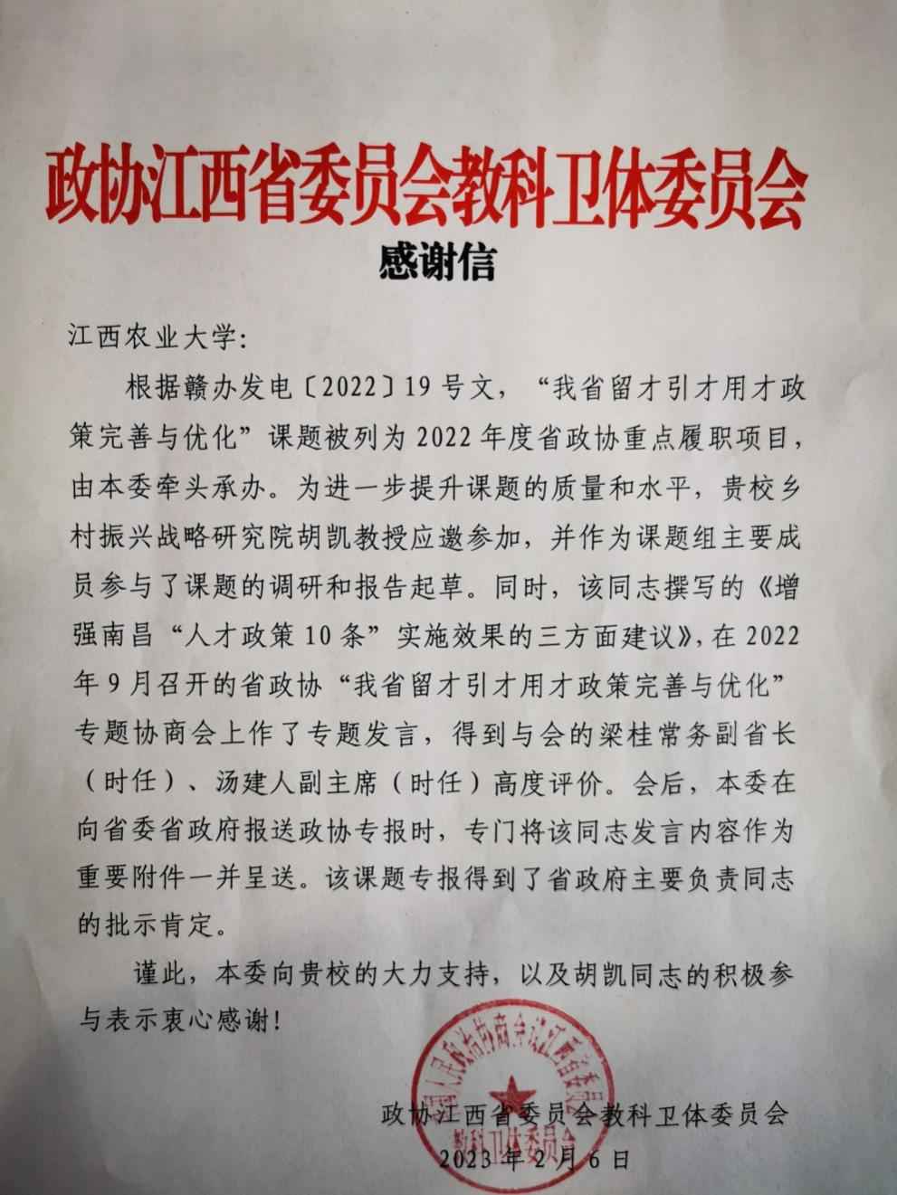 近日,政协江西省委员会教科卫体委员会向我校发来感谢信,对胡凯教授积极参与由教科卫体委员会牵头承办的2022年度省政协重点履职项目“我省留才引才用才政策完善与优化”表示感谢。