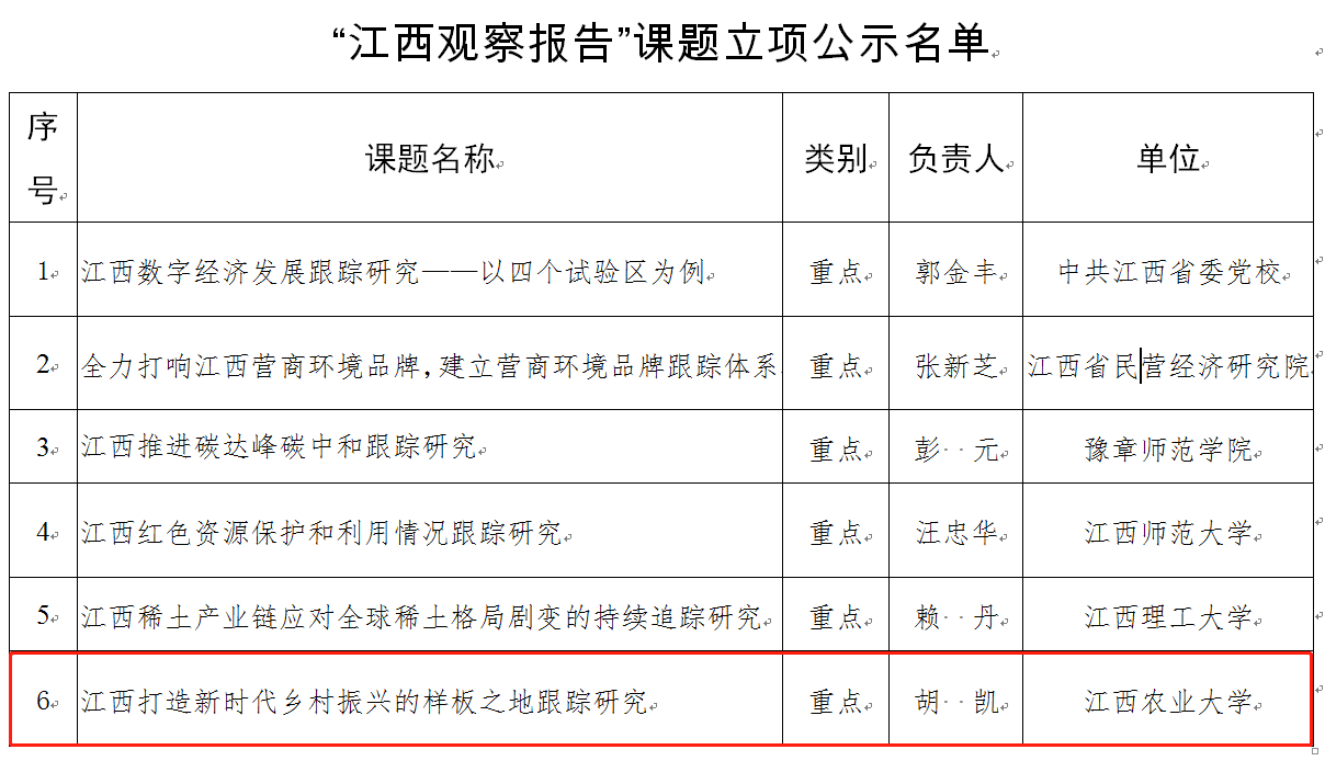 近日,江西省社会科学界联合会公示2022年度“江西观察报告”课题立项名单,经管学院胡凯教授申报的课题“江西打造新时代乡村振兴的样板之地跟踪研究”喜获立项,被列为省社科基金重点项目;该研究将对乡村振兴样本之地进行跟踪研究,总结与提炼出样本之地取得成功的经验与发展路径,为其他村庄发展提供借鉴,也为江西乡村振兴贡献江农智慧。