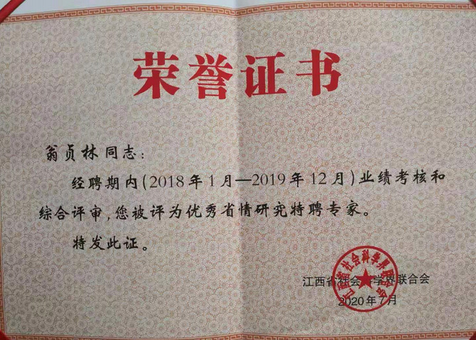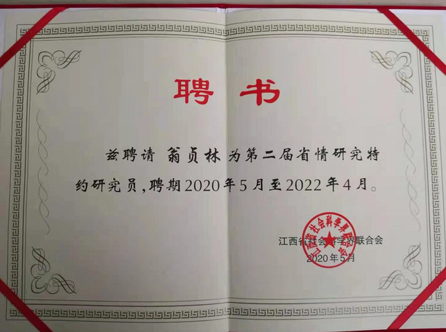 翁贞林教授理论水平高,研究积累深厚,被聘为江西省第一届与第二届省情特约研究员,他积极参与省情研究,取得了丰富的研究成果,为江西地方经济发展努力出谋划策,被评为优秀省情研究特聘专家。