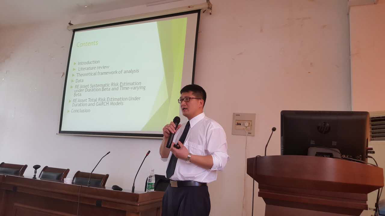 6月22日上午,新西兰梅西大学李云博士应邀来我院作“金融久期,证券市场贝塔和地产投资风险(An Empirical ex-ante approach to real estate investment risk)”主题报告。报告会由副院长朱红根教授主持,全院100余名教师、研究生和本科生参加了报告会。李云博士按照标准的国际论文写作规范,以新加坡数据为例,利用时间序列数据GARCH模型,验证了金融久期和证券市场贝塔对地产投资风险的影响。